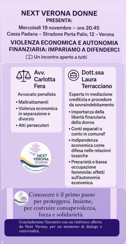 L’Avv. Carlotta Fera affronterà i profili legali legati ai maltrattamenti , atti persecutori e violenza economica nelle separazioni e nei divorzi , mentre, la Dott.ssa Laura Terracciano approfondirà temi come la libertà finanziaria , la differenza tra i conti separati o in comune , l’indipendenza economica e gli effetti della precarietà sull’autonomia femminile.